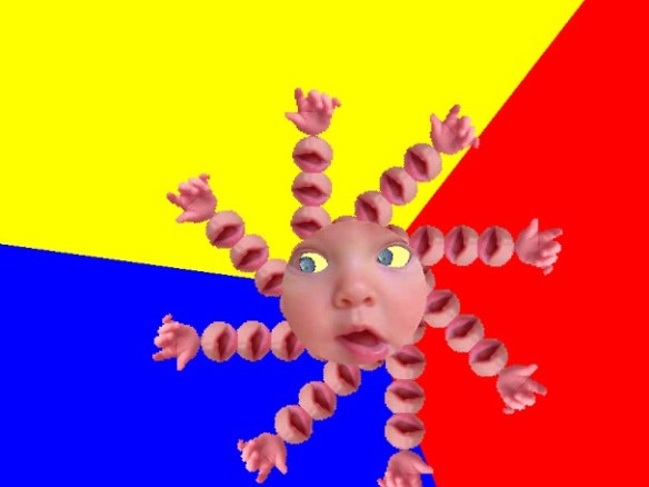 I like to call Stage 4 “The Creature”—a strange octopus composed of baby parts. Its main body is a large baby head. Dozens of mouths link together forming eight tentacles with hands at their tips. The Creature is the playable character of the level, situated in an environment that looks to be nothing more than rapidly flashing lights.