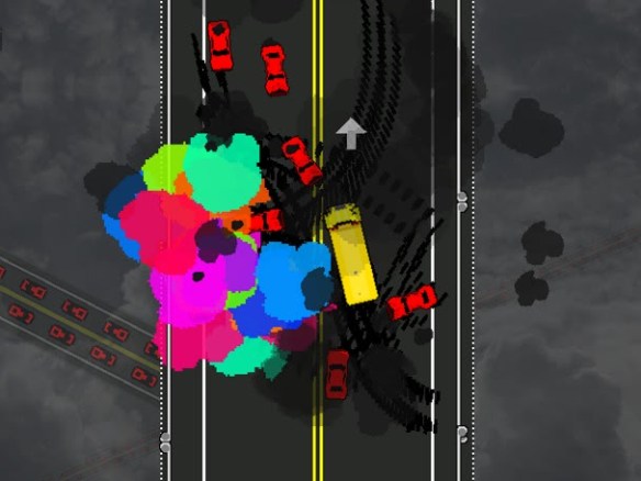 Oddly, huge wrecks look appealing instead of gruesome. Explosions billow rainbows of colourful smoke, which morph into pixelated smudges that obscure the freeway and lead to more crashes. Stage 1 successfully combines vehicular mayhem with comedic sound effects and delightful colours to produce an uncomfortable mood that is tough to ignore.