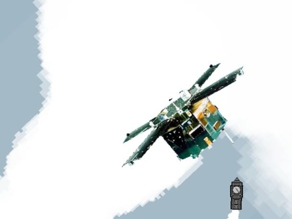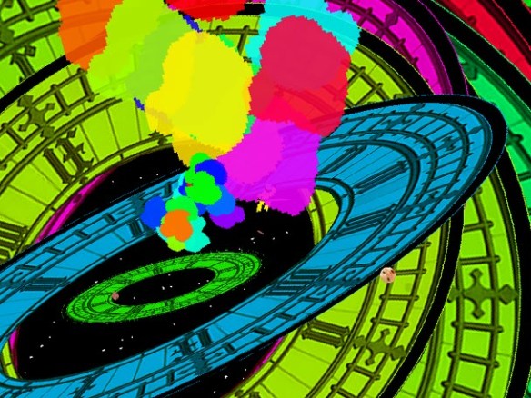 Stage 2 commences, providing a better look at the unidentified flying object. Up close and without the burning redness, the projectile is clearly a clock tower flying through the air. Archaic satellites litter the sky as the clock tower’s prey. Hitting a satellite breaks a piece off the flying tower and destroys the target, causing more raucous drums and colourful explosions.