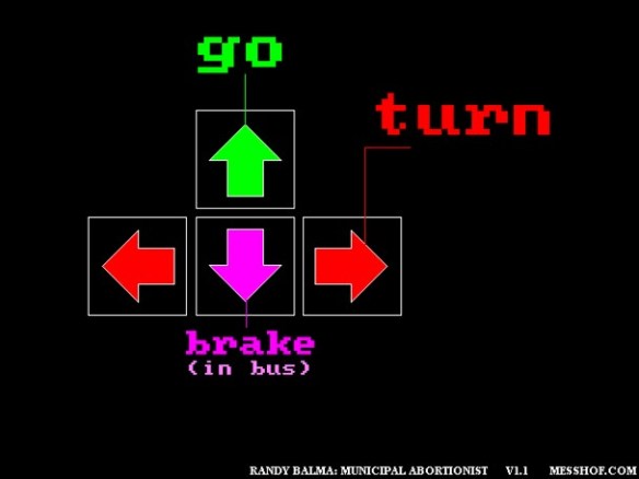 Among its themes, Randy Balma: Municipal Abortionist toys with concepts of control. The first three stages have elements that hinder the user by obscuring the field of view or by supplying improper movement. Such methods of disorientation make the user feel less capable of controlling the player, and they depict a mix of confusion, inebriation, and powerlessness within the main character. Supposing this game does relate to Randy Balma, how can we criticize his actions if we are not fully in control either?